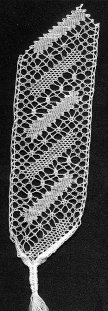 To make up: lay the two pieces of lace on top of one another so that the passive strips coincide. Sew them together around this line. Make a pin cushion or lavender sachet 3/4 inches square and insert it between the two layers of lace. The feathers form a frill around the edge.