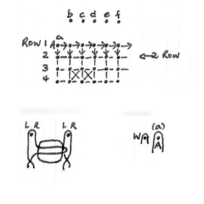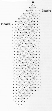 Refer to the diagram. Start on the left-hand side of the pricking. Place pin in A and hang on passive pair (a). With workers on support pin W (see fig I) work half stitch and twist. The workers are now ready to work with pair (b) hanging on support pin (b). Work half stitch, pin, half stitch and twist, repeat with pairs (c); (d). etc. to the end of the row. Remember to remove all support .pins. To begin row 2 * place edge pin in pinhole between last pair and workers and work cloth stitch and two twists. For the rest of the row work half stitch, pin, half stitch and twist. NB all first (edge} pinholes to be worked as *.