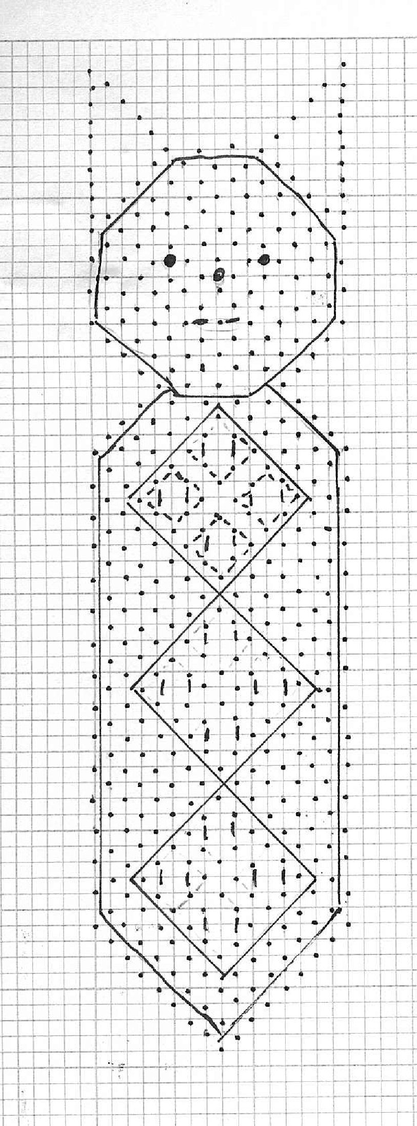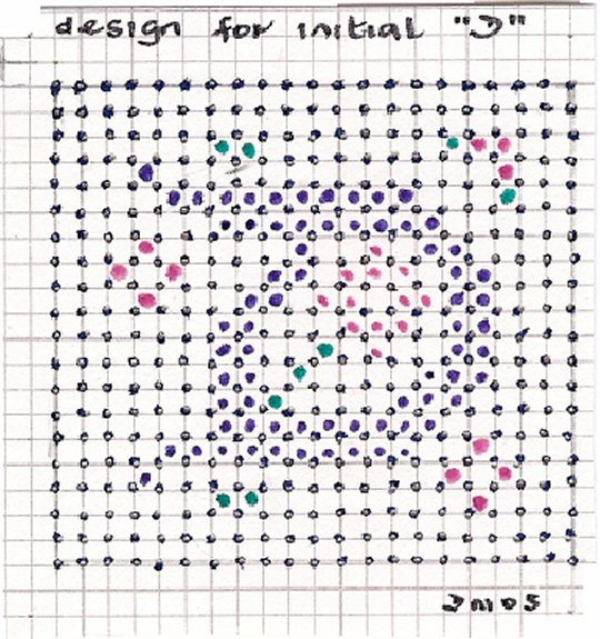 2. Ink in all the pinholes and mark the squares matching the colours to the beads (see X in diagram) Colour is better than symbols which can be confusing in a small space.