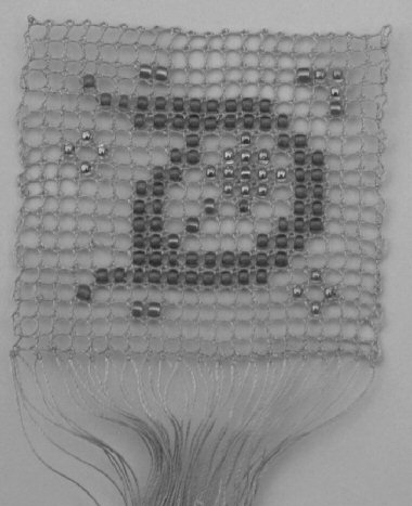 Although I am firstly a lacemaker I am also a beadworker and interested in various ways of using beads. There is an Australian magazine which publishes cross stitch patterns that have a dual purpose, either as traditional cross stitch or with beads, on canvas. I have also experimented with beads stitched on to pre-punched card representing canvas. I was pleased to be shown, by a friend who had attended a course, some projects using, instead of a loom, lace to make warp and weft threads with beads creating the designs. Any cross stitch patterns are suitable and graph paper is ideal for charting new one. The following is my interpretation.