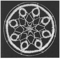 Stitches used: Torchon ground (half stitch, pin, half stitch), Rose ground (cloth and twist without a pin, half stitch, pin, half stitch around the rose), torchon foot.