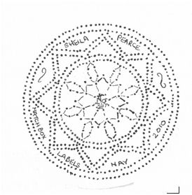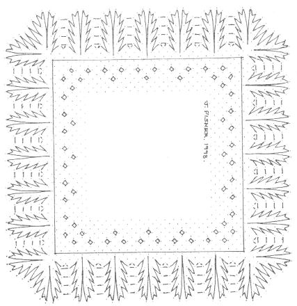 19 pairs of bobbins wound with DMC Refors d'Alsace 30's or similar thread are needed for the large square and 12 pairs for the inner square.