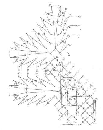 Begin at the comer fan. Letters on the diagram indicate support pins, numbers are permanent pins in order worked, except for pin A which has 2 pairs hung open on it, the left-hand pair of which becomes the weaver of the fan. Work the fan, adding and leaving out pairs as required, following the arrows and the number sequence until pin 13 is reached. Now lay in the pairs for the torchon- and rose-ground. The two passive pairs between pins 15 and 77 are worked in cloth stitch, with one twist on each side. At pin 26 a torchon foot is worked.