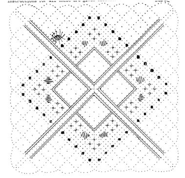 The inner square: this is worked on the same pricking. The two passives form its outer edge, so pin 15 has one pair hung on it. Cloth stitch through the passives and ground stitch at pin 17. Cloth stitch back through the passives and put two twists on this pair before putting pin 18 under it. This gives a firm edge.